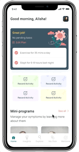 Following the personalization of the app through onboarding questions, users would receive tailored recommendations for a mini program. This program delved into comprehensive details about understanding symptoms, self-management techniques, and guidelines on when to seek professional consultation.